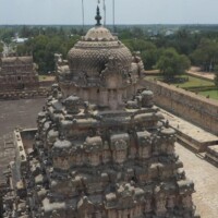 The temple dedicated to Siva is referred to in the earlier inscriptions as Raja Rajeswaram. The temple considered to be one of the four stately temples of the Imperial Cholas was constructed by Raja Raja Chola II (CE 1160-1180). The temple is east oriented. It is covered by double prakara walls. The inner prakara with its double storeyed cloister comprises of main temple and a shrine for Chandesa. A separate shrine for Amman is on the north of the main temple. The main temple comprises of a garbhagriha, ardha-mandapa, mahamandapa, Agra mandapa and a pillared hall known as Rajagambiran mandapa. The dvaja sthamba, balipita and ornate Nandi mandapa are found outside the prakara wall. The vimana raised on bold adhisthana rises to an height of 83 ft. The five tala vimana is crowned by circular griva and sikhara. The Rajagambiran mandapa is artistically designed as chariot with hubs and spokes and is drawned by horses. The temple is a treasure house of sculptures. The upapita of main temple is decorated with panels depicting unique deeds of 63 Nayanmars. The pillars in the mukha mandapa are decorated with innumerable dance postures. Interestingly the sculptures on the gopura are labeled.