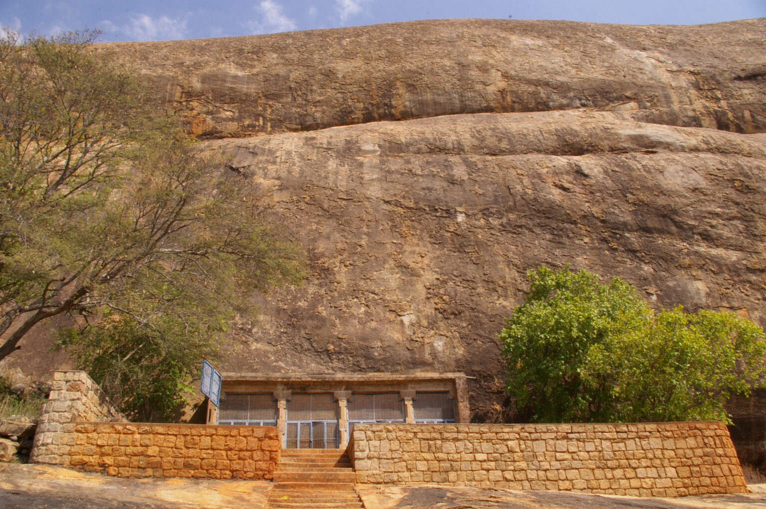 Sittannavasal is a village in the Iluppur taluk of Pudukkottai district, Tamil Nadu. This monument is located at about 12 km northwest from Pudukkottai, 2 km north east from Annavasal, 12 km north from Kudumiyanmalai. Known as Arivarkovil or temple of the Arhats, this rock-cut temple was considered earlier to be a excavation of Pallava king Mahendravarman I ( CE 580-630) before his conversion from Jainism to Hinduism. However, considering its geographical location in the Pandyan King, this cave-temple is now assigned to the reign of Pandyan king, this cave-temple is now assigned to the reign of Pandya kings Maran Sendan AD (654-670), when the Pandya rule was at its high and the later was a Jain prior to his conversion. The façade, slightly cut into the original rock-line, has two pillars and two pilasters with square base and top with interveaning octagonal portion. There is an ardha-mandapa behind with a square sanctum at the back. The entrance to the sanctum has a flight of steps with balustrades. There bas reliefs in the ardha-mandapa of Parsvanathar (northern niche) seated in dhyana pose with fie hooded serpent above the head and of saint seated in dhyana pose (southern niche) under a single umbrella. There is a label inscription reading Tiruvasiriyan. In the sanctum on its back wall are three more bas-reliefs of two Jaina Tirthankaras as denoted by the triple chhatris and an Acharya. However, the most significant feature of the cave-temple is the occurrence of mural paintings depicting the theme of Samavasarana, the most delightful of Jain heavens, and particularly the second bhumi viz. khatika-bhumi or region of the tank. The paintings depicts a vast tank full of lotus flowers. Also depicted are bhavyas or the faithfuls, elephants and fishes, one of them is flying out of waters. This scene was painted as a canopy on the ceiling of the ardha-mandapa. On the pillars, are painted beautiful picture of two dancers at two places and three figures identified as the king strimara Srivallbha and his queen paying respects to Ilam Gautaman, and Acharya from Madurai. Upon cleaning the paintings, another layer of painting was also discovered depicting the same Samavasarana theme in a carpet design in the garbha-griha. These paintings executed in a superior fresco technique to that of Ajanta, has shades of influence of that school in idom.