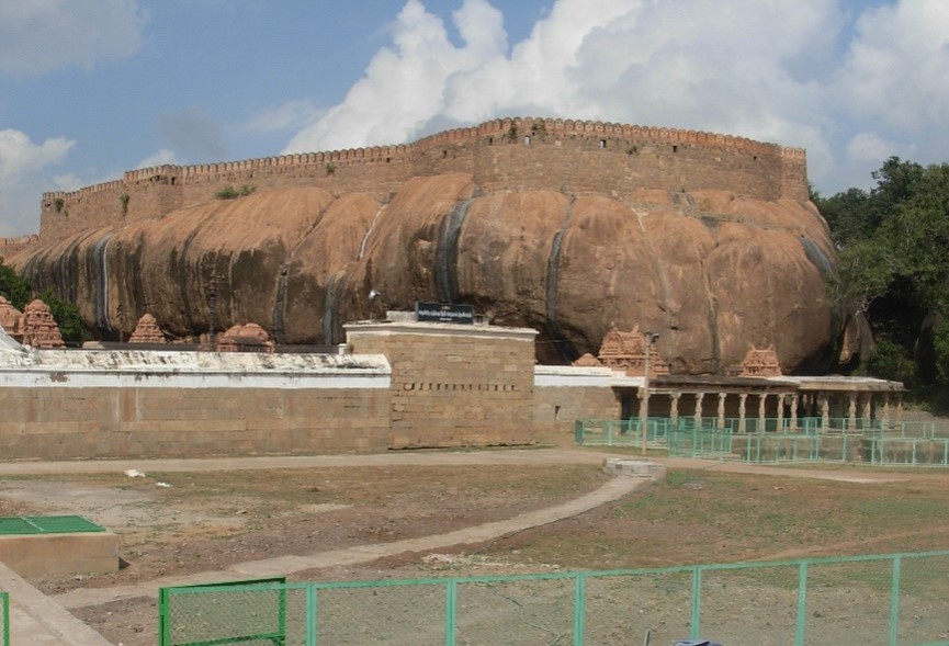 Tirumayam is located about twenty kilometers south of Pudukkottai. This fortified monument is located at about 20 km south from Pudukkottai, 28 km west from Ponnamaravathi.The fortification around the rock at Tirumayam was erected by Sethupati Vijaya Raghunatha Tevan (CE 1673-1708) of Ramanathapuram, popularly known as Kilavan Sethupati. The fort later came under the control of Tondaiman rulers of Pudukkottai. It has a main gateway on the east in the lower most walls with shrines for guardian deities like Ganesa, Hanuman and Bhairava. There is a most around the lower wall. On the top of the rock is bastion with cannon of British origin. The construction of the fort is of inferior quality as small blocks of stones were used along with bricks for the crenelations. Within the fortification are located three rock-cut temples, two of them dedicated to Siva and the other to Vishnu. |